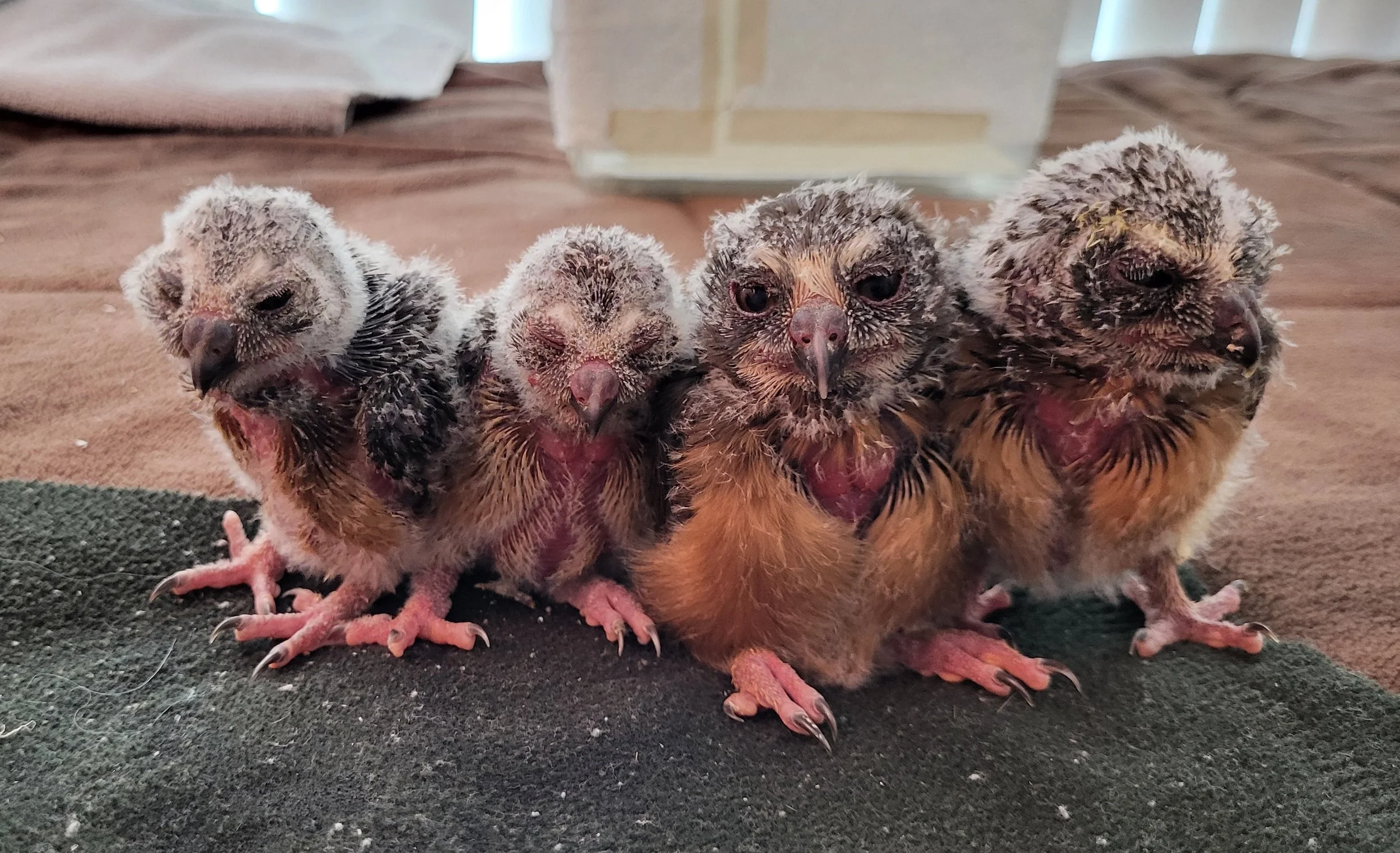 A nest of Northern Saw-whet owl babies fell 30 feet to the ground when their tree was cut down. The little babies, no more than 4 inches tall, were transported to Wildcare for care. Wildcare attempted to reunite them with their parents by placing them back in a nest box; however, the parents did not return. The babies are being raised at Wildcare, where they have been growing fast for the last 5 weeks. They are flying and beginning to hunt on their own and will be preparing for their release back to the wild soon.